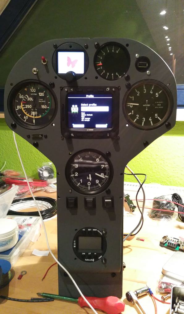 Dann die beiden kleinen Instrumente (LX V9 und Butterfly-Flarm) oben reinbasteln und letztlich die Löcher für Sicherungen und Schalter noch einbauen. |
